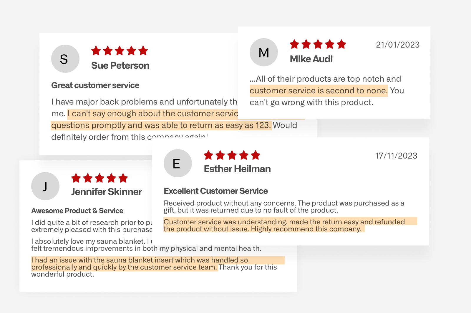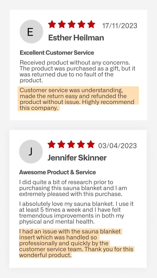 Our major competitors all either make the customer pay for return shipping, which can be hefty given that sauna blankets are relatively large and substantial; or they do not accept returns unless the blanket is in an unused or pristine condition – which can make it tricky for you to really test it out, since that inevitably involves sweating into it!